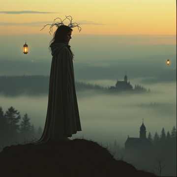 Folk / Indie Folk, Neo-medieval, fantasy, cinematic, Traditional folk storytelling, theatrical performance, some bardic/medieval flair, Female solo vocal and the vocal style is Emotional, expressive, theatrical like a storyteller recounting a myth. Moderate tempo (~80–100 BPM, ballad‑like but steady) Mood: Melancholy, reflective, slightly tragic Emotion: Longing, resignation, subtle power behind the calm delivery