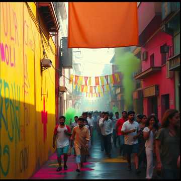 Upbeat Bollywood-Holi anthem with male vocals; dhol–tasha groove locked to a bright pop kit, brass stabs and festive synthetic leads. Verses stay bouncy and percussive with call-and-response shouts; chorus explodes into gang vocals and claps. Short breakdown in the bridge with only dhol, handclaps, and crowd chants before a final, stacked-hook reprise.